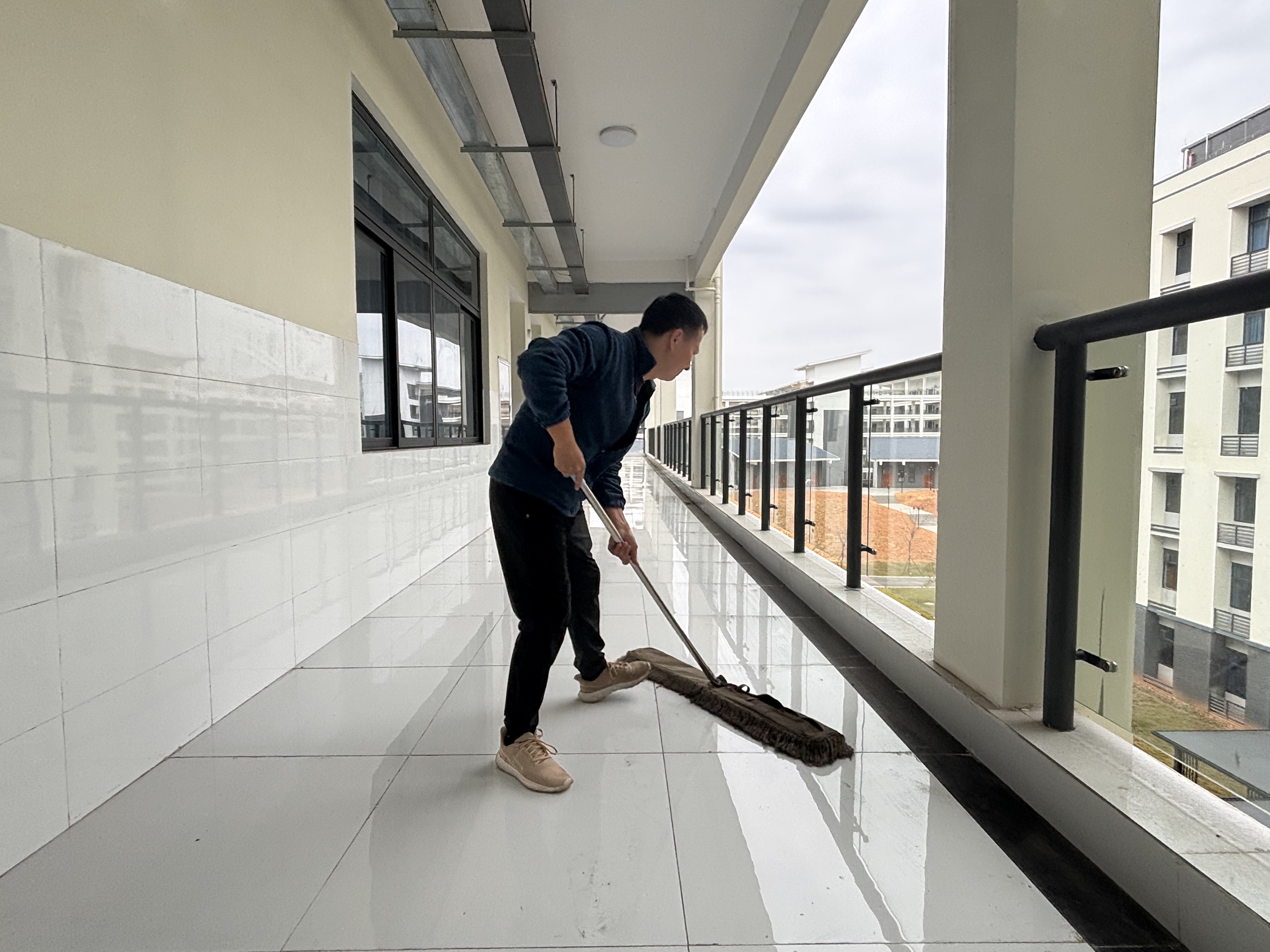 图为教职工认真清扫过道走廊(蒋慧/摄)