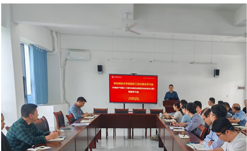 10月28日下午,绿色新技术学院召开全体教职工专题学习会,集中学习党的二十届四中全会精神。学院党委书记罗金主持会议并领学《中国共产党第二十届中央委员会第四次全体会议公报》,传达学校党委常委会扩大会议关于学习贯彻党的二十届四中全会精神的部署要求。