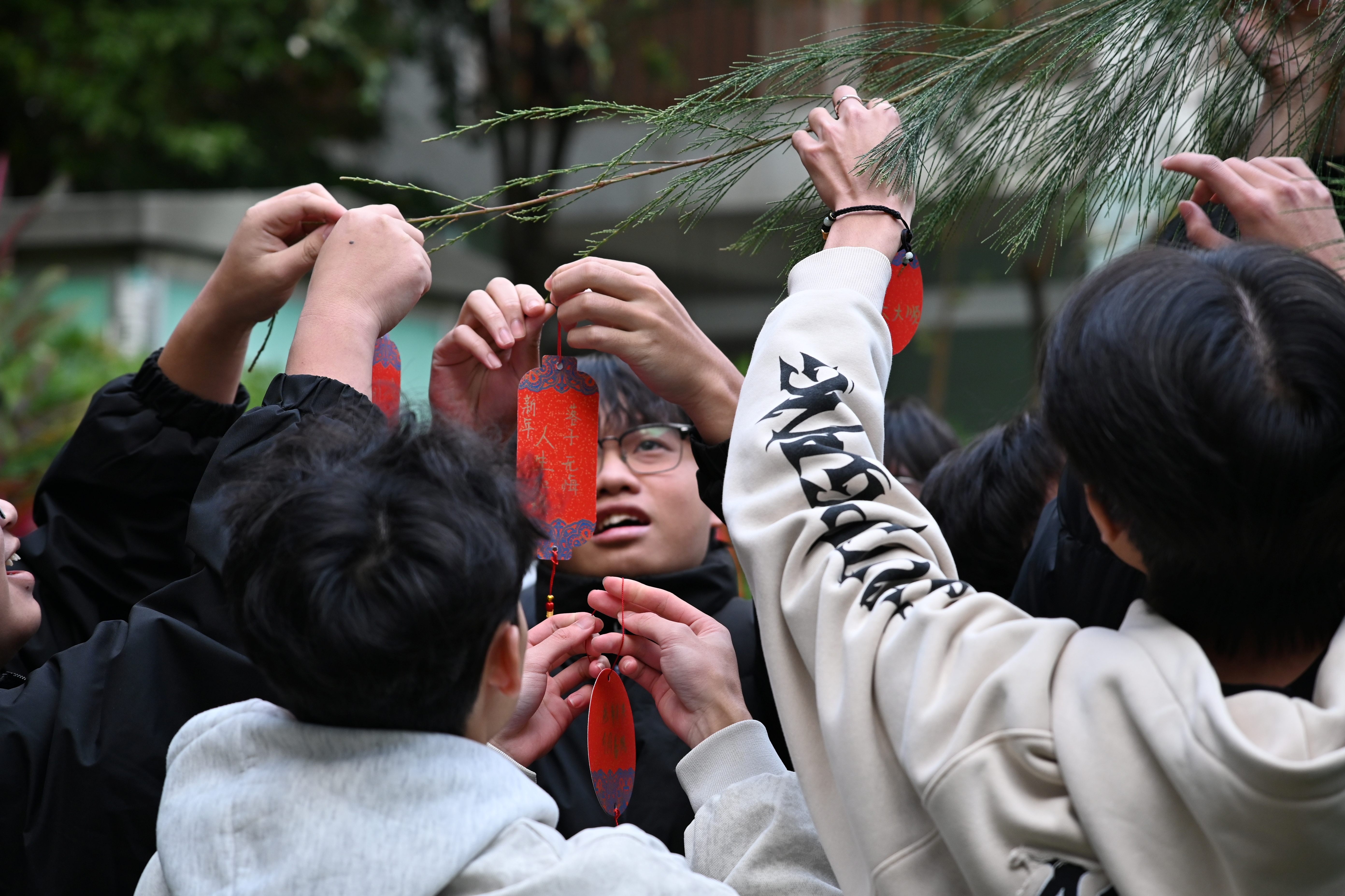 同学们正在将心愿签挂在树上(蒋家勇/摄)