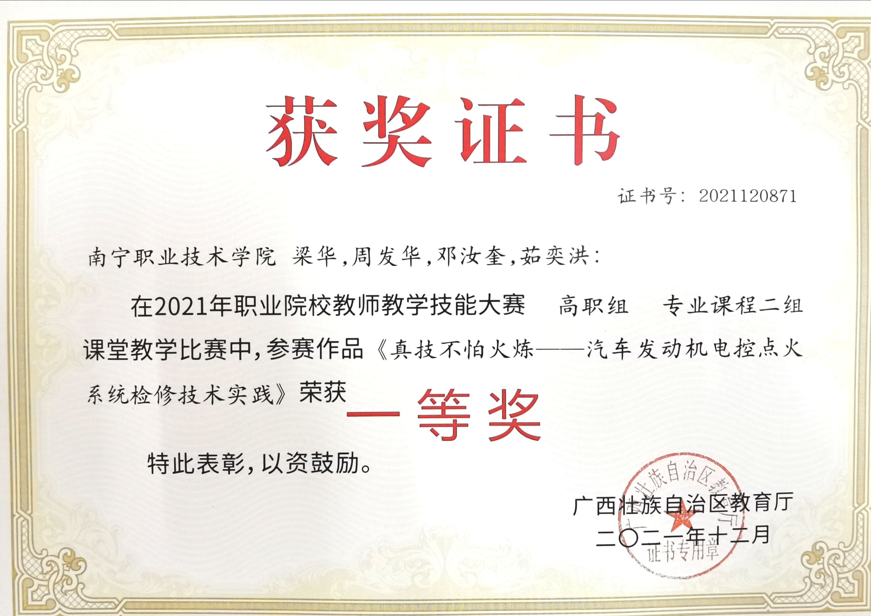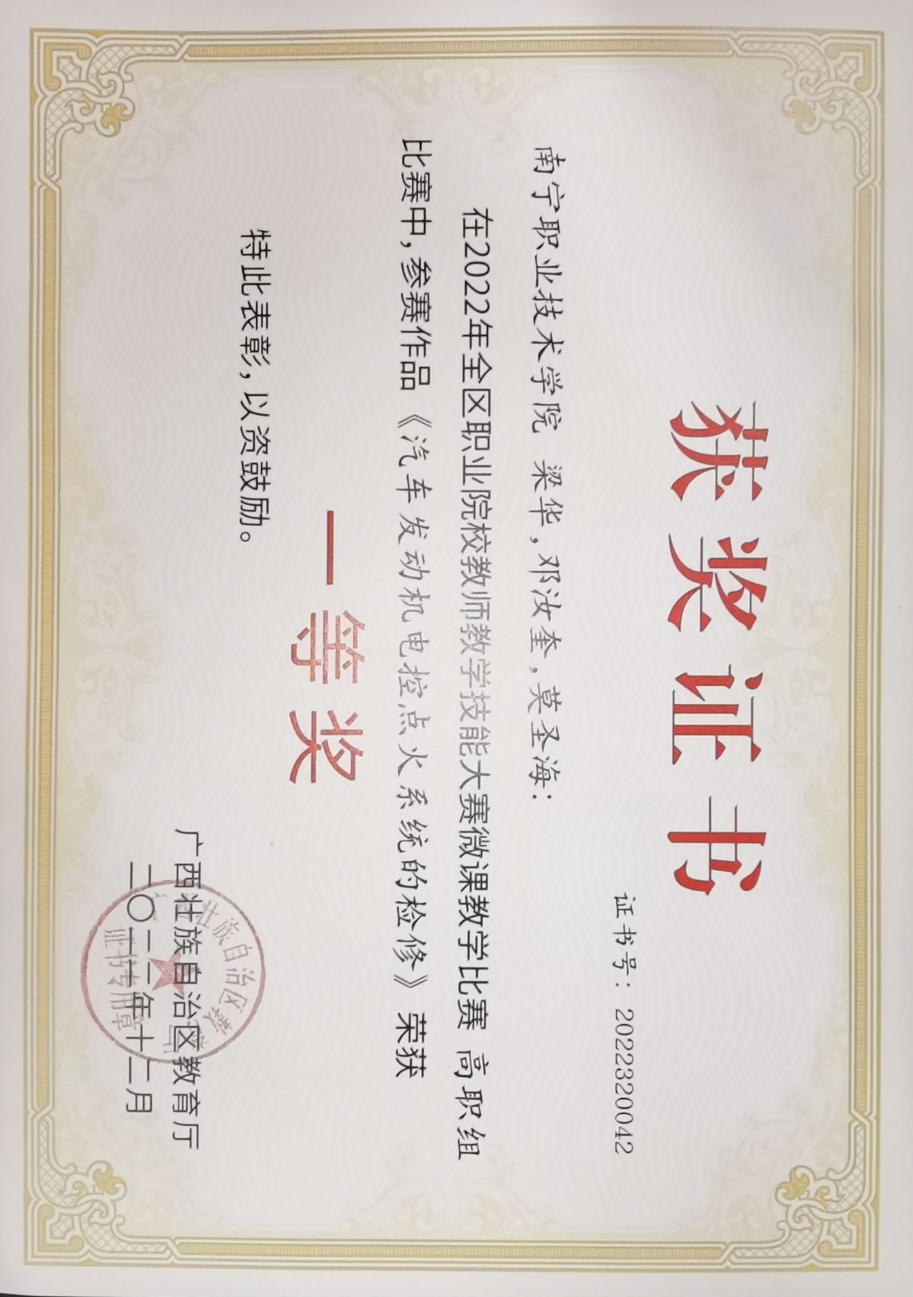 新能源汽车技术专业教师团队16人,其中博士6人、硕士8人,来自企业一线的兼职教师5人;获“广西技术能手”1人、“广西五一劳动奖章”1人、南宁市技术能手1人。